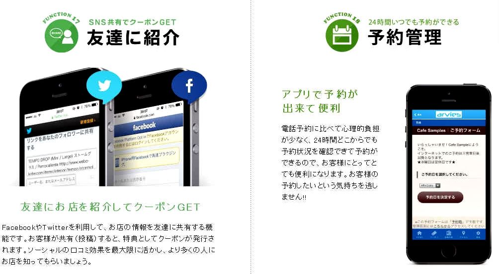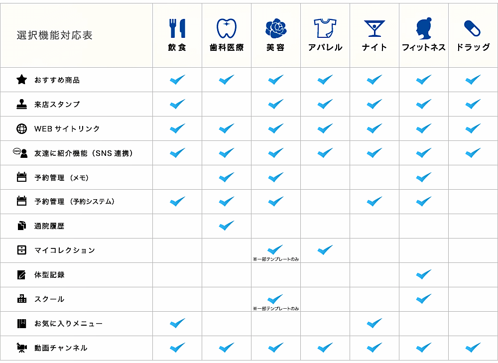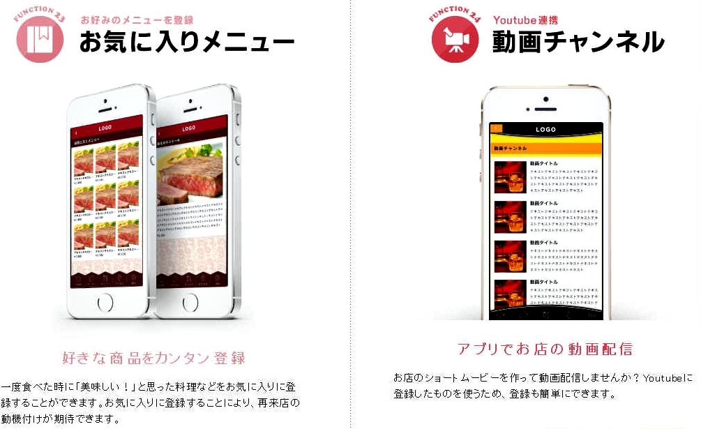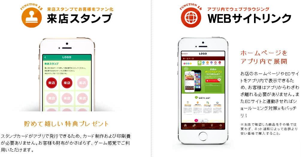 ■ 機能紹介 お客様の”囲い込み”にはプッシュ通知が効果的!みせプリは、プッシュ通知やバッジ表示に対応しています。お客様がアプリをインストールするだけで、直接メッセージを届けることができます。メルマガと違って会員登録などが不要のため、お客様はアプリを通していつでも簡単に情報を受け取ることができます。<< 各種基本機能 >><< ホーム画面に表示されるの4つのアイコンボタンを選べます >><< 業種のテンプレートによって選択できる機能が異なります。 >>*テンプレート一覧は、こちら をご覧下さい。選択できる機能電子スタンプサービス (有料オプション)専用の管理画面からブログを作成するような感覚で、アプリを作成、編集、更新できます。 ↑このページのトップヘ